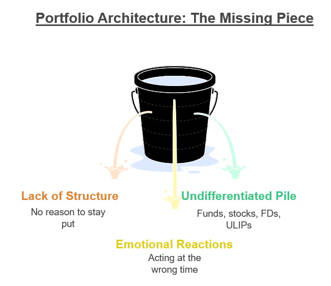 Everything sits in one undifferentiated pile — some mutual funds here, a few stocks there, an FD from three years ago, a ULIP someone sold them.