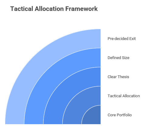 - A pre-decided exit. Before you enter a tactical position, you decide when you will exit — either when the thesis plays out or when it clearly has not.